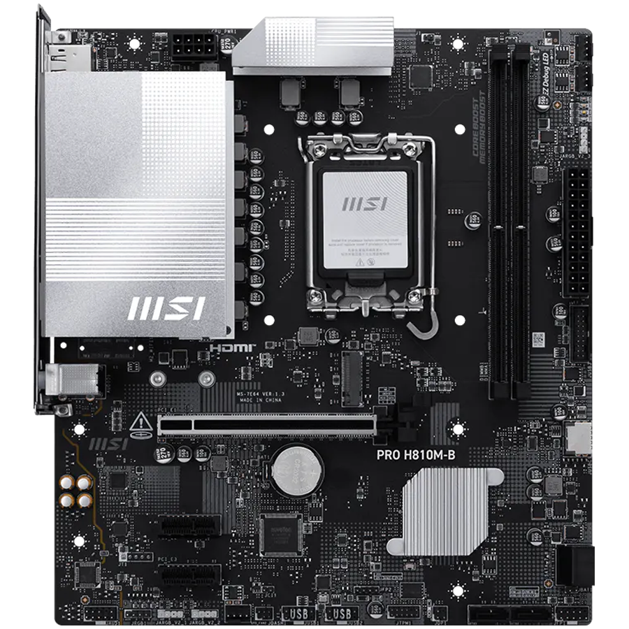 MSI PRO H810M-B, mATX, LGA 1851, 2x DDR5 Dual Channel DDR5 up to 6400(OC)MHz, 1x PCIe x16 slot, 1x M.2 slot, 4x USB 2.0, 2x USB 5Gbps, HDMI, DP, 7.1 HD Audio, 2.5G LAN, 3Y